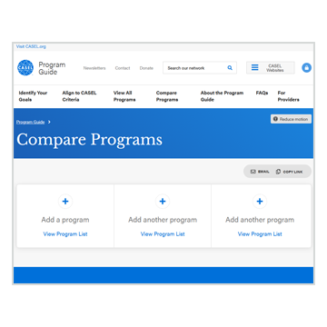 Use CASEL’s online tool to review and compare programs that help students develop strong social and emotional skills. Search by grade or grade level, program approach, setting, student characteristics, and other criteria.